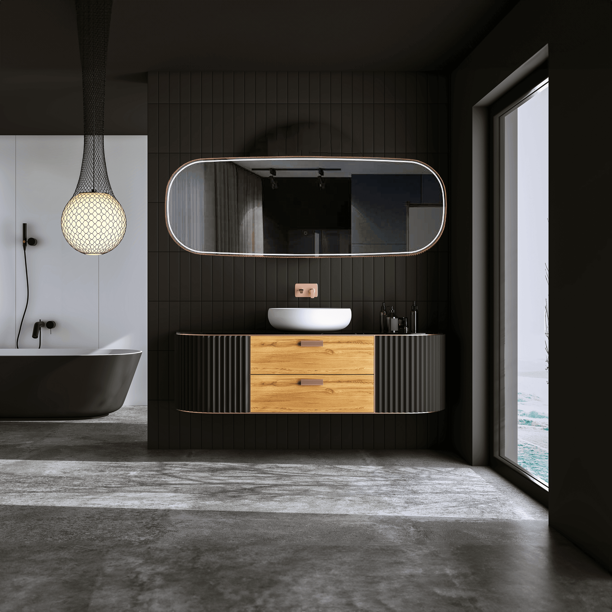 Step beyond ordinary bathroom essentials with the HIGHWOOD, a masterpiece that seamlessly blends artistry and functionality. Its sleek, oval design commands attention with its sophisticated allure, while the striking Gold-Rose frame adds a touch of warmth and luxury to your space. The integrated LED lights take this mirror to the next level, casting a soft, ambient glow that highlights your best features and elevates your bathroom experience.